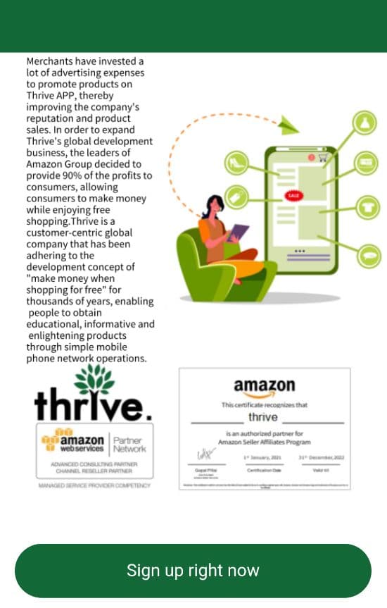 Thrive是一家以客户为中心的全球性公司,千百年来一直秉承“免费购物也能赚钱”的发展理念,让人们通过简单的手机网络操作就能获得有教育意义、信息丰富、富有启发性的产品。商家投入了大量的广告费用在Thrive APP上推广产品,从而提升了公司的声誉和产品销量。为了扩大Thrive的全球发展业务,亚马逊集团领导层决定将90%的利润让给消费者,让消费者在享受免费购物的同时还能赚钱。