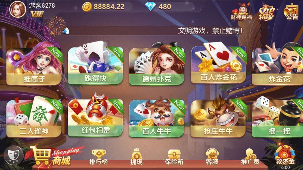 跑的快,斗地主,龙虎,推筒子,二人麻将,骰宝,飞禽走兽,血战麻将,红包扫雷,五星宏辉,德州扑克,连环夺宝,九线拉王,ATT连环炮,红黑,六人牌九,六人三公,大闹天宫,寻龙夺宝,奔驰宝马,港式五张,水浒站,21点等29款游戏。